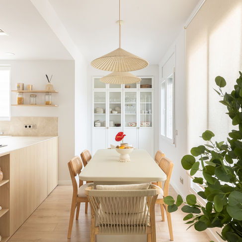 En la cocina, el mobiliario en acabado madera se integra perfectamente con una encimera de aspecto pétreo en tonos beige, que aporta textura y elegancia sin recargar el ambiente. La zona de comedor, cuidadosamente compuesta, se ilumina con lámparas de fibras vegetales y se conecta visualmente con un salón de líneas suaves, donde destacan piezas de diseño curvilíneo, textiles ligeros y una paleta muy equilibrada.
